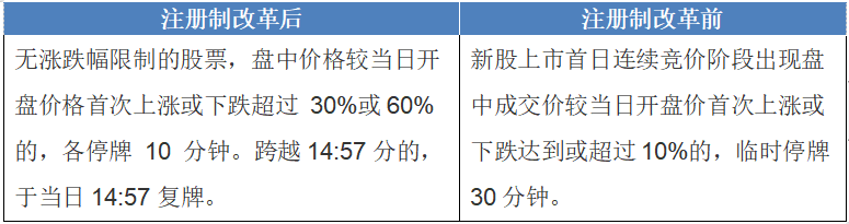 由于改革后的创业板新股上市的前5日没有价格涨跌幅限制,所以改革后的拍中临时停牌机制更细化了。
