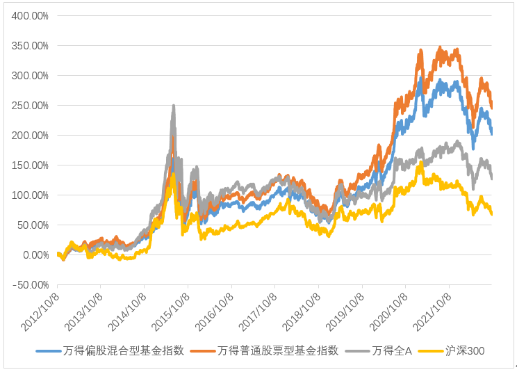 公募基金作为专家理财的代表,具有专业优势,适合投资者作为长期投资工具。Wind统计,从2012年10月8日至2022年9月30日,万得偏股混合型基金指数(885001.WI)上涨了199.93%,年化收益率11.97%;万得普通股票型基金指数(885000.WI)上涨了243.44%,年化收益率13.53%。这两只权益类基金指数均获得了超过同期沪深300指数和万得全A指数的出色表现。