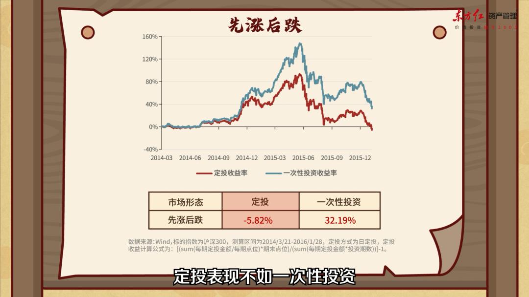 先涨后跌:2014年3月21日至2016年1月28日,市场先涨后跌,定投表现不如一次性投资。