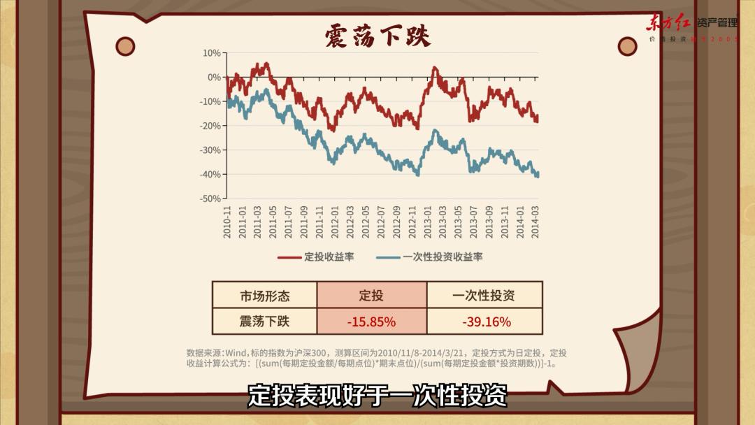 震荡下跌:2010年11月8日至2014年3月21日,市场震荡下跌,定投表现好于一次性投资。