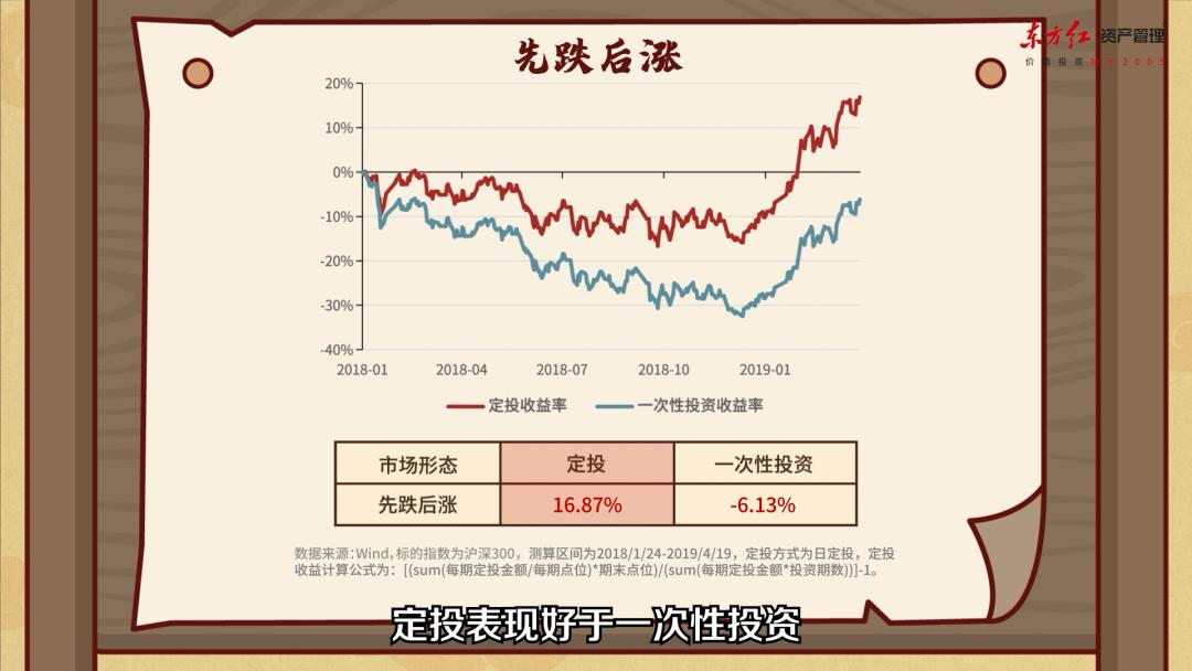 先跌后涨:2018年1月24日至2019年4月19日,市场先跌后涨,定投表现好于一次性投资。